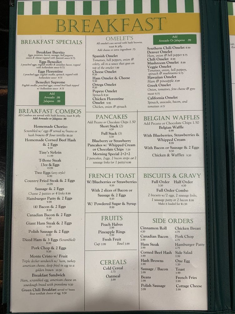 Tiny's Family Restaurant, located in Payson, AZ, offers a cozy American dining experience ideal for families. With a casual atmosphere and moderate noise level, it's perfect for a relaxed meal. Customers rave about the friendly staff and delicious, fresh food at reasonable prices. The menu offers a wide variety of options, from burgers to steak breakfasts, ensuring there's something for everyone. The ambiance is warm and inviting, with two dining rooms and comfortable seating. Standout dishes include homemade soup, fresh salads, and tasty desserts. Overall, Tiny's Family Restaurant impresses with its excellent service, extensive menu choices, and welcoming environment. It's a must-visit spot for a satisfying meal with loved ones.